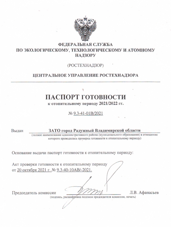 Комиссия Центрального управления Ростехнадзора по оценке готовности муниципальных образований Владимирской области к отопительному периоду 2021-2022 г.г. на заседании, которое состоялось 20.10.2021 г., установила готовность к работе в отопительном периоде муниципального образования ЗАТО г. Радужный Владимирской области. Ростехнадзором выдан паспорт готовности к отопительному периоду 2021-2022 г.г. муниципальному образованию ЗАТО г. Радужный Владимирской области.