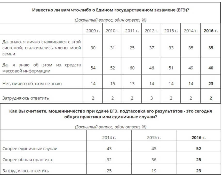 Спустя 7 лет после повсеместного введения в нашей стране единого госэкзамена (ЕГЭ) о нем знают 75% россиян. Из них 35% сообщили, что они сами, их дети или родственники сталкивались со сдачей ЕГЭ. Еще 40% никак не участвовали в этом, но слышали об экзамене из новостей. С 2013 года именно эта доля снизилась на 11%. В то время как доля тех, кто ничего не знает о ЕГЭ увеличилась на 9% (с 14% в 2012 до 23% в 2016 гг.).