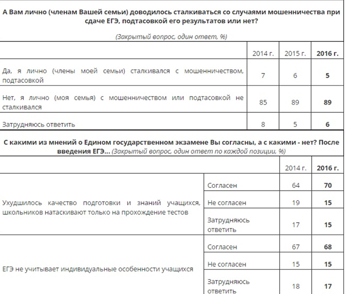 Никогда не встречались с подтасовкой или мошенничеством при проведении единого госэкзамена 89% россиян. 5% сообщили, что они сами или члены их семьи лично сталкивались с такими случаями. Их число незначительно снизилось за последние три года (с 7% в 2013 г.).