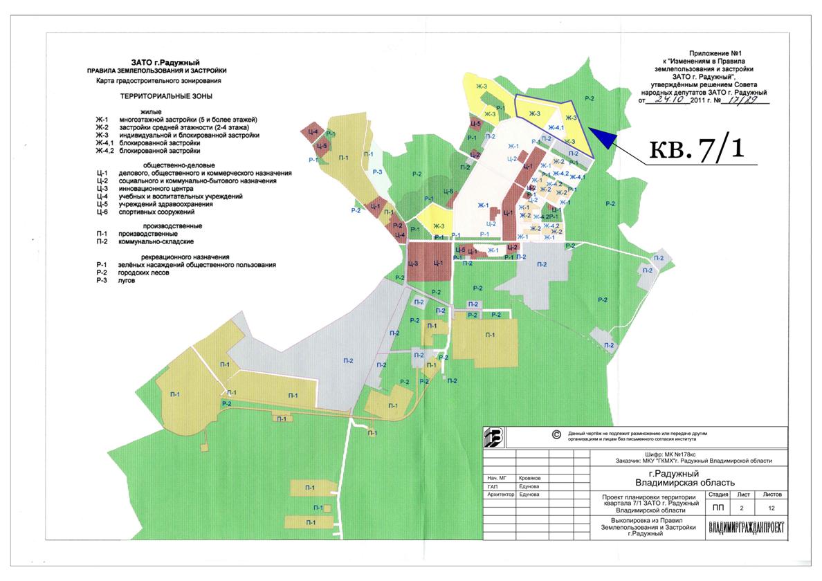 1. Утвердить проект планировки территории квартала 7/1 ЗАТО г. Радужный, разработанный ГУП ГПИ «Владимиргражданпроект», согласно приложению.