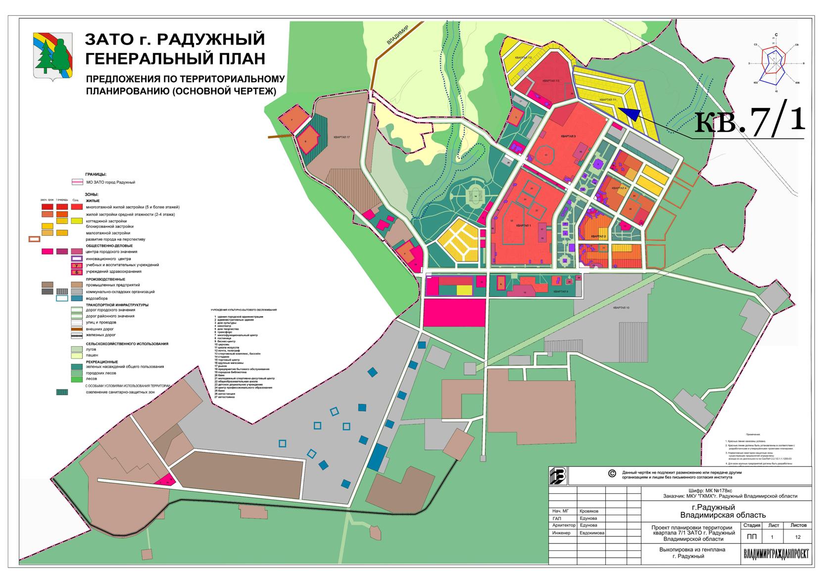 В соответствии с постановлением главы города ЗАТО г. Радужный от 27.08.2013 г. № 66 «О подготовке проекта планировки территории квартала 7/1 ЗАТО г. Радужный Владимирской области», заключением о результатах публичных слушаний от 24.10.2013 г. по проекту планировки территории квартала 7/1 г. Радужного, утвержденным постановлением администрации ЗАТО г. Радужный от 05.12.2013 г. № 1744, рассмотрев разработанную государственным унитарным предприятием Владимирской области - головной проектный институт «Владимиргражданпроект» (далее – ГУП ГПИ «Владимиргражданпроект») проектную документацию «Проект планировки территории квартала 7/1 ЗАТО г. Радужный», руководствуясь статьями 8, 45, 46 Градостроительного кодекса Российской Федерации, ст. 36 Устава муниципального образования ЗАТО г. Радужный,