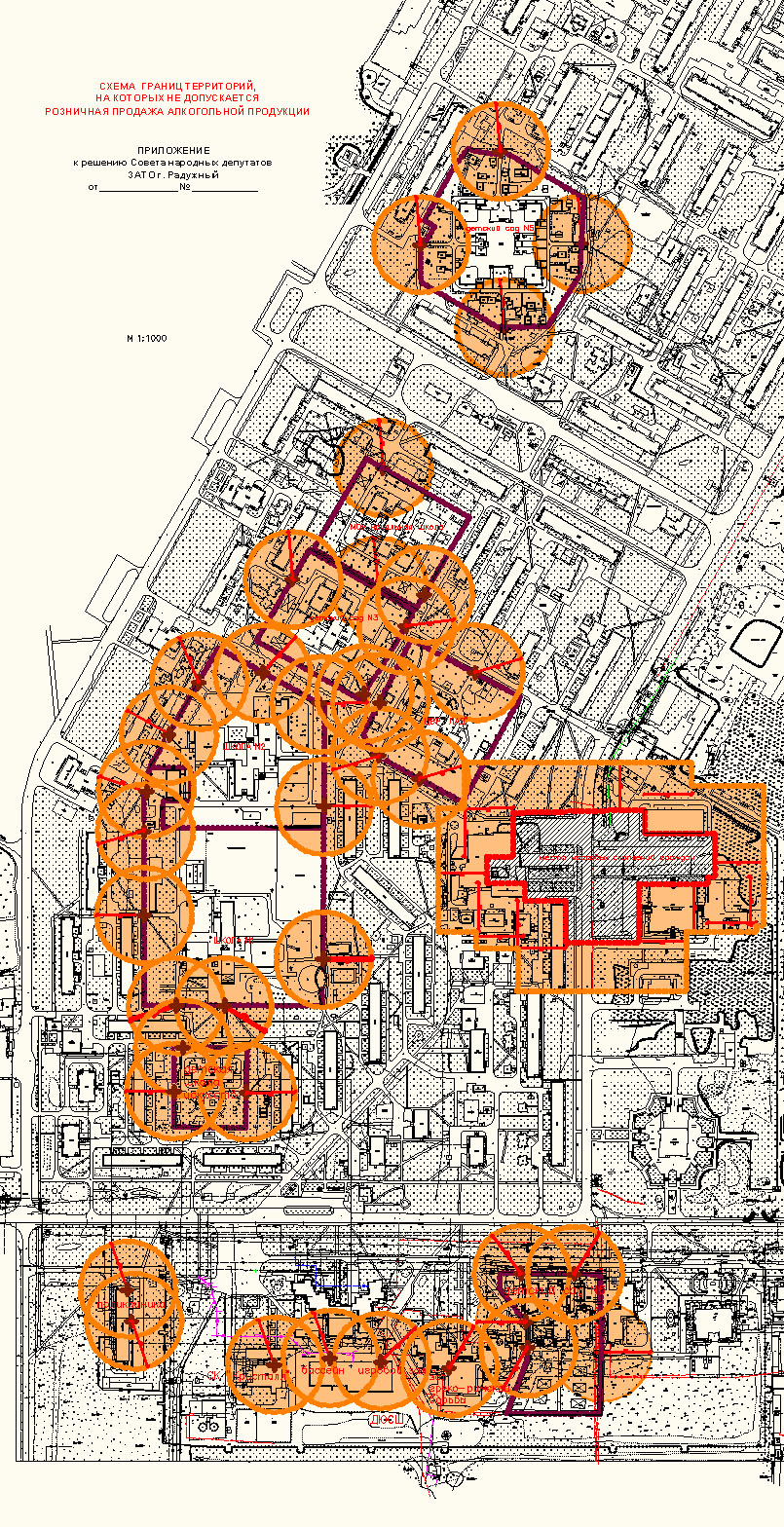 1.Определить минимальное значение расстояния от детских, образовательных, медицинских организаций, мест массового скопления граждан до границ прилегающих территорий, на которых не допускается розничная продажа алкогольной продукции - 50 метров.