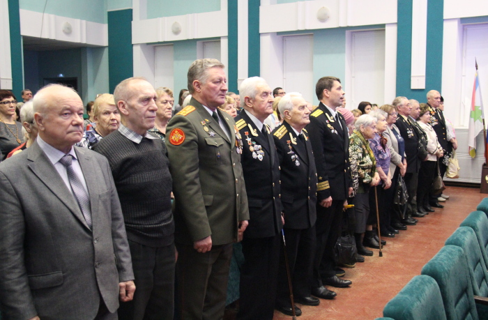 Ведущие программы Дина Свешникова и Ксения Захарова тепло поздравили с праздником всех сидящих в зале и пригласили на сцену для приветствий и проведения церемонии награждения заместителя главы администрации ЗАТО г. Радужный по социальной политике и организационным вопросам, капитана III ранга запаса С.С. Олесикова, председателя городского совета ветеранов, капитана II ранга в отставке В.П. Жирнова и военкома г.Радужного, полковника В.Л. Долотова.
