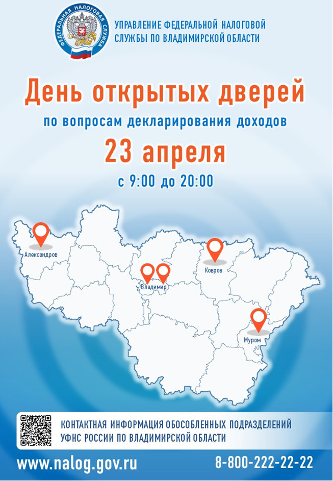 23 апреля с 9:00 до 20:00 в обособленных подразделениях УФНС России по Владимирской области пройдет региональная акция «День открытых дверей» для налогоплательщиков – физических лиц.