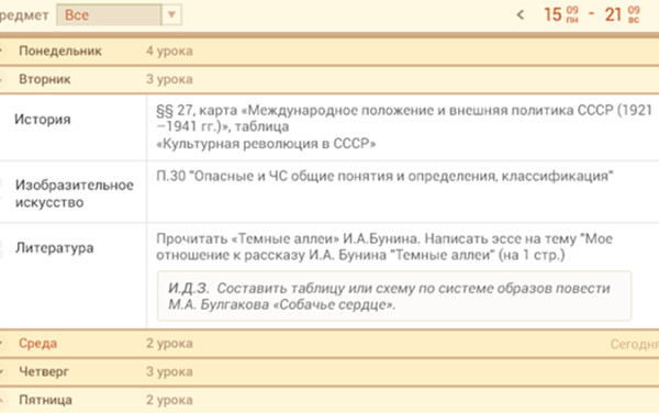 При необходимости можно выбрать отображение данных по одному из предметов, воспользовавшись выпадающим списком вверху экрана. В генерируемой электронным дневником Барс 33 таблице домашних заданий присутствует:название предмета;изучаемый материал и домашние упражнения;прикрепленные файлы домашнего задания, если таковые имеются.