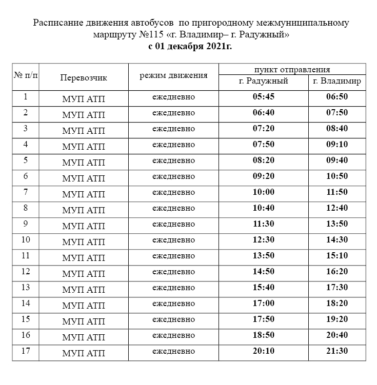 С 1 декабря 2021 года в расписании движения автобусов по пригородному межмуниципальному маршруту №115 « г. Владимир - г. Радужный» будут внесены изменения. Добавится рейс в 18.50 из г.Радужного и в 20.40 из г.Владимира.