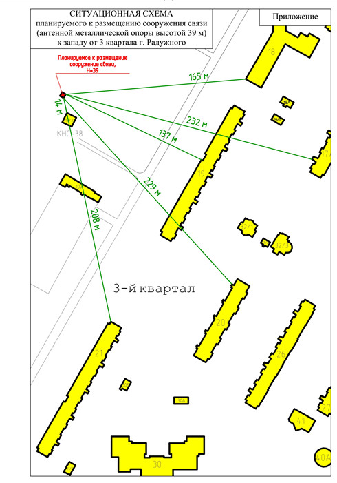 Заявитель – общество с ограниченной ответственностью «Виндсоул», г. Москва, ИНН 9721060570, обратилось в администрацию ЗАТО г. Радужный с заявлением о выдаче разрешения на размещение сооружения связи на земельном участке, расположенном к западу от 3-го квартала г. Радужного, примерно в 14 метрах на северо-запад от существующей канализационно-насосной станции КНС-38. Планируемое к размещению сооружение связи – металлическая опора, высотой 39 метров, для размещения на ней антенного оборудования).