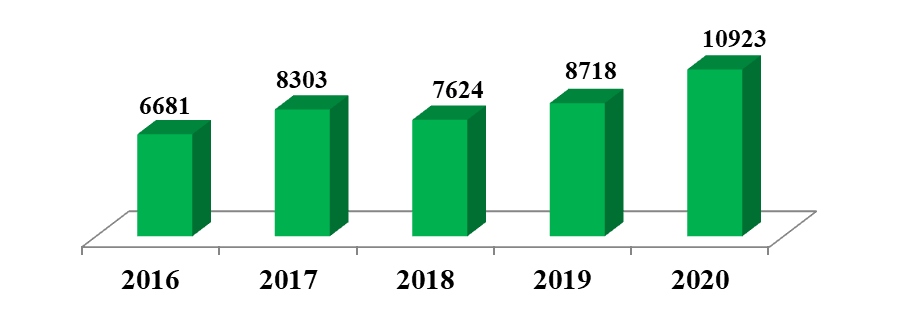 в 12450 гектаров (в 2016г.–3827 га, в 2017г. –5145 га, в 2018г.–8140 га, в 2019г. – 9841 га). Известняковой муки и других известняковых материалов в прошлом году было внесено 61 тыс. тонн(в 2016г. –17 тыс. тонн, в 2017г. –25 тыс. тонн, в 2018г.–39 тыс. тонн, в 2019г.–50 тыс. тонн).